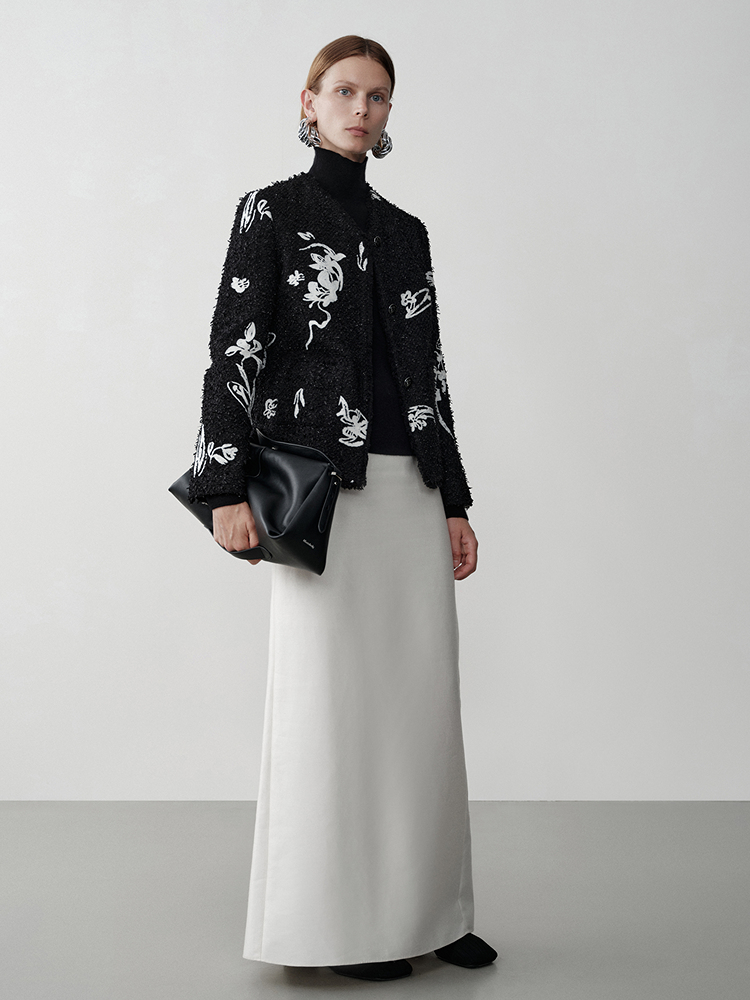 キルティングの技法で立体感を持たせた繊細な刺繍が特徴的で、どんな装いも格上げする一枚です。