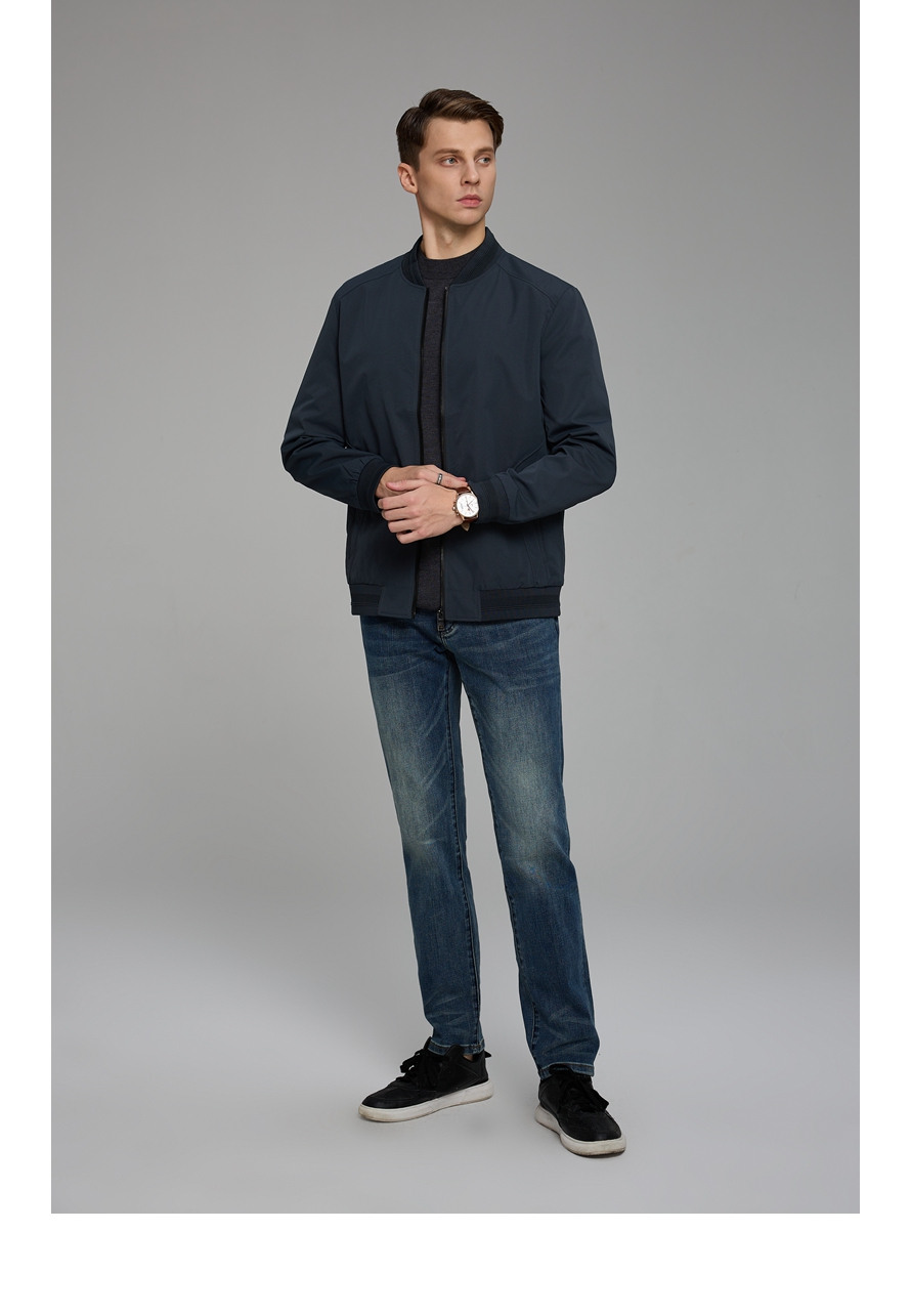シンプルながらも洗練された立ち襟デザインのノーカラージャケット。