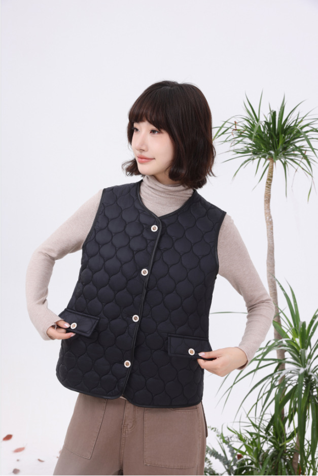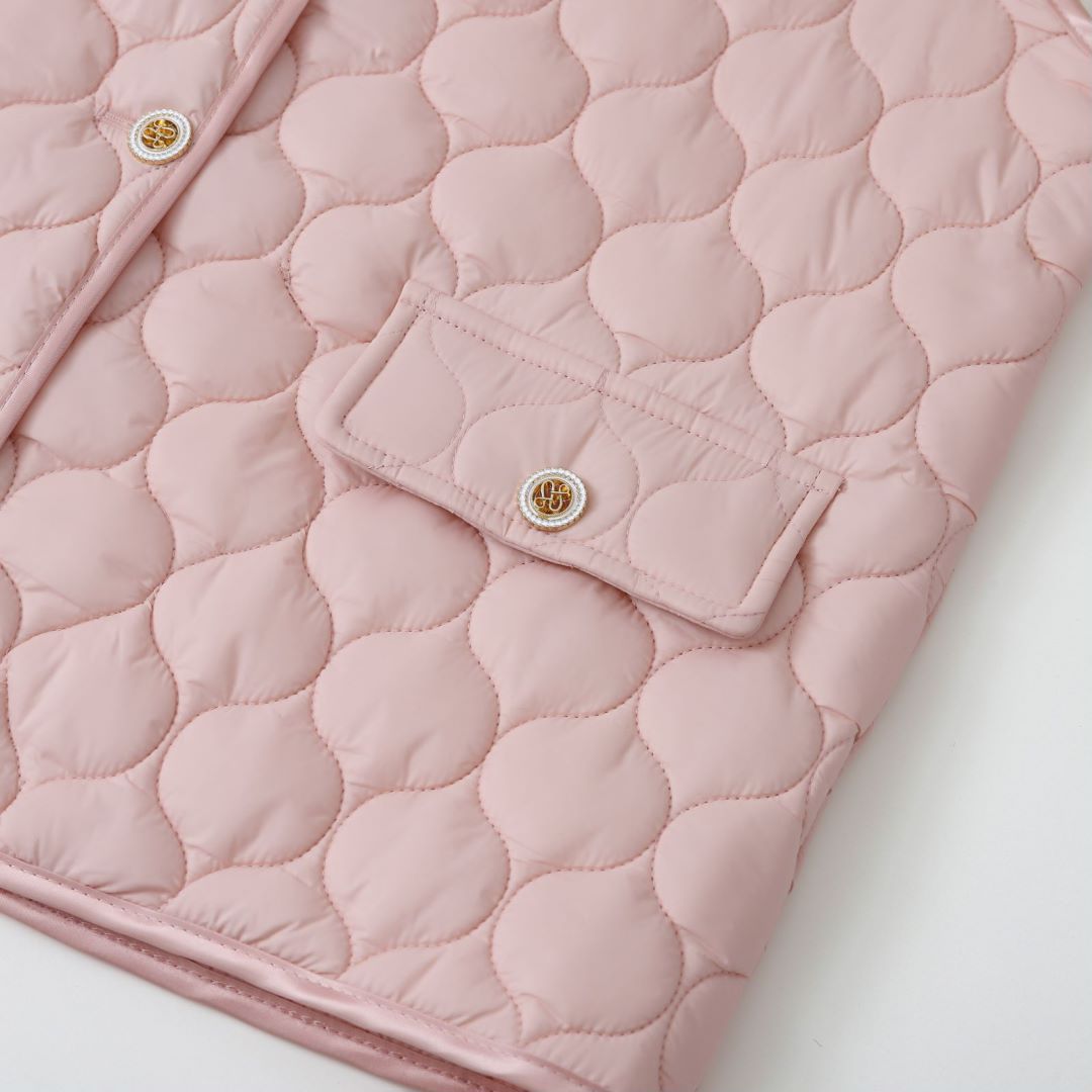 洗練された印象を与えるノーカラージャケットは、上品なキルティング加工が特徴。中綿入りで、寒い季節でもしっかりとした保温性を実現。シンプルなデザインなので、さまざまなスタイルに合わせやすく、重ね着にも最適です。日常使いから特別なシーンまで活躍する一着です。